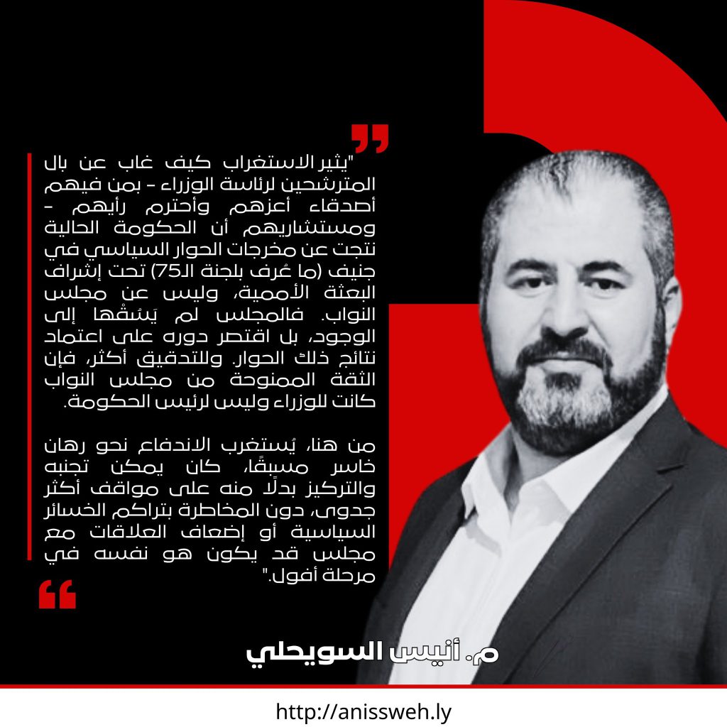 “يثير الاستغراب كيف غاب عن بال المترشحين لرئاسة الوزراء – بمن فيهم أصدقاء أعزهم وأحترم رأيهم – ومستشاريهم أن الحكومة الحالية نتجت عن مخرجات الحوار السياسي في جنيف [ما عُرف بلجنة الـ75] تحت إشراف البعثة الأممية، وليس عن مجلس النواب.