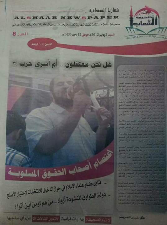 في صباح يوم السبت، الثاني من يونيو 2012، فوجئت بوجهي يحدق إليّ من واجهة إحدى الصحف بين أيدي المارة. كانت “صحيفة الشعاب”، في عددها الثامن، قد اختارت نشر صورتي على غلافها تحت عنوان كبير: “هل نحن معتقلون أم أسرى حرب؟؟”. التقطت العدسة اللحظة وأنا أقف في قلب الاعتصام أمام مقر رئاسة الوزراء في طرابلس، ممسكًا بالميكروفون، محاطًا بزملائي من المعتقلين السابقين الذين خرجنا معًا للمطالبة بحقوقنا المهدرة. كانت وجوههم تحمل نفس السؤال الذي انعكس في العنوان: أين عدالة الدولة التي حاربت من أجلها؟.